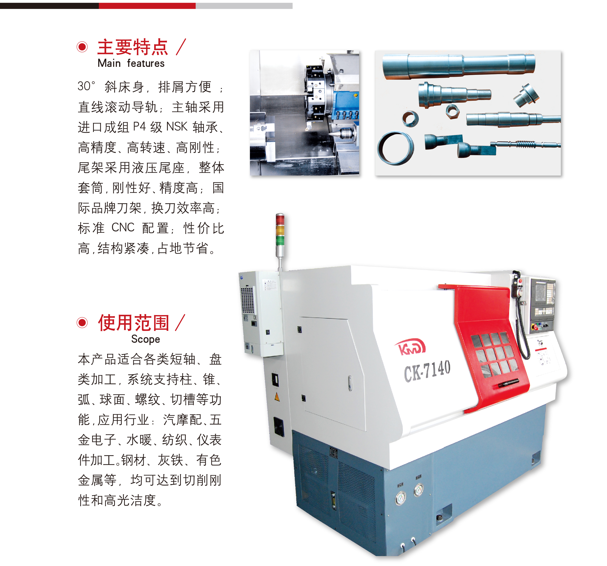 簡要描述(shù): 30度斜床身,排(pai)屑方便;直線(xian)滾動導軌;主(zhu)軸采用進口(kǒu)成組P4級NSK軸承(cheng)💋,高精度、高轉(zhuǎn)速、高剛性;尾(wei)架采用液壓(ya)尾座,整體套(tào)筒,剛性🚶好、精(jīng)度高;國際品(pǐn)牌刀架,換刀(dāo)效率高;标準(zhun)CNC配置,性價比(bi)高,結構緊湊(cou),占地節省。