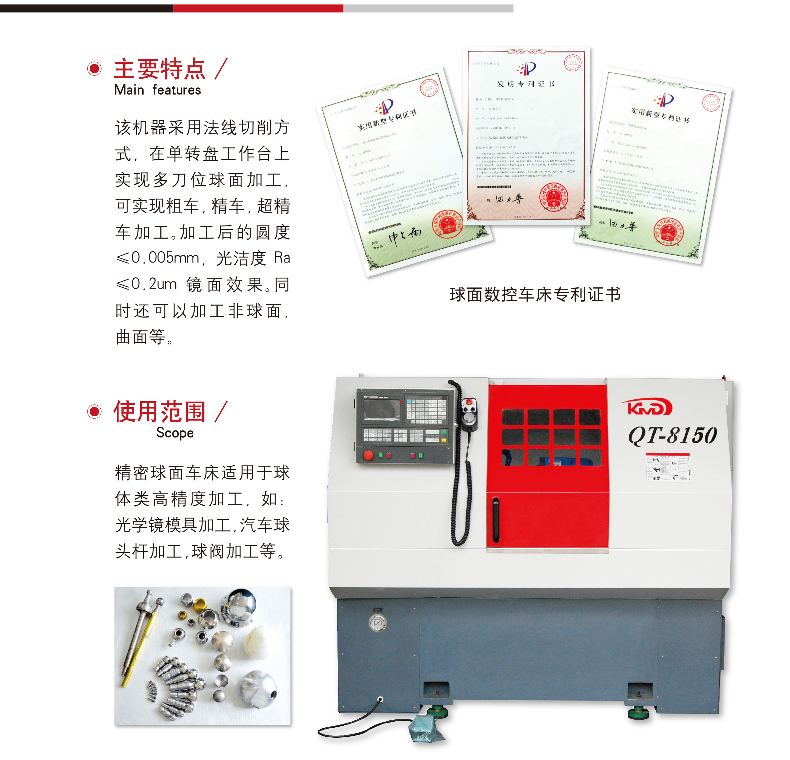 簡要描述(shù): 該機器采(cǎi)用法線切(qiē)削方式,在(zài)單轉盤工(gōng)作台上實(shi)現多刀位(wèi)球面加工(gōng),可實現粗(cu)車,精車,超(chāo)精車加工(gōng)。加工後的(de)圓度≤0.005mm,光潔(jié)度Ra≤0.2um鏡面效(xiào)果。同時還(hái)可以加工(gōng)♻️非球面,曲(qu)面等。