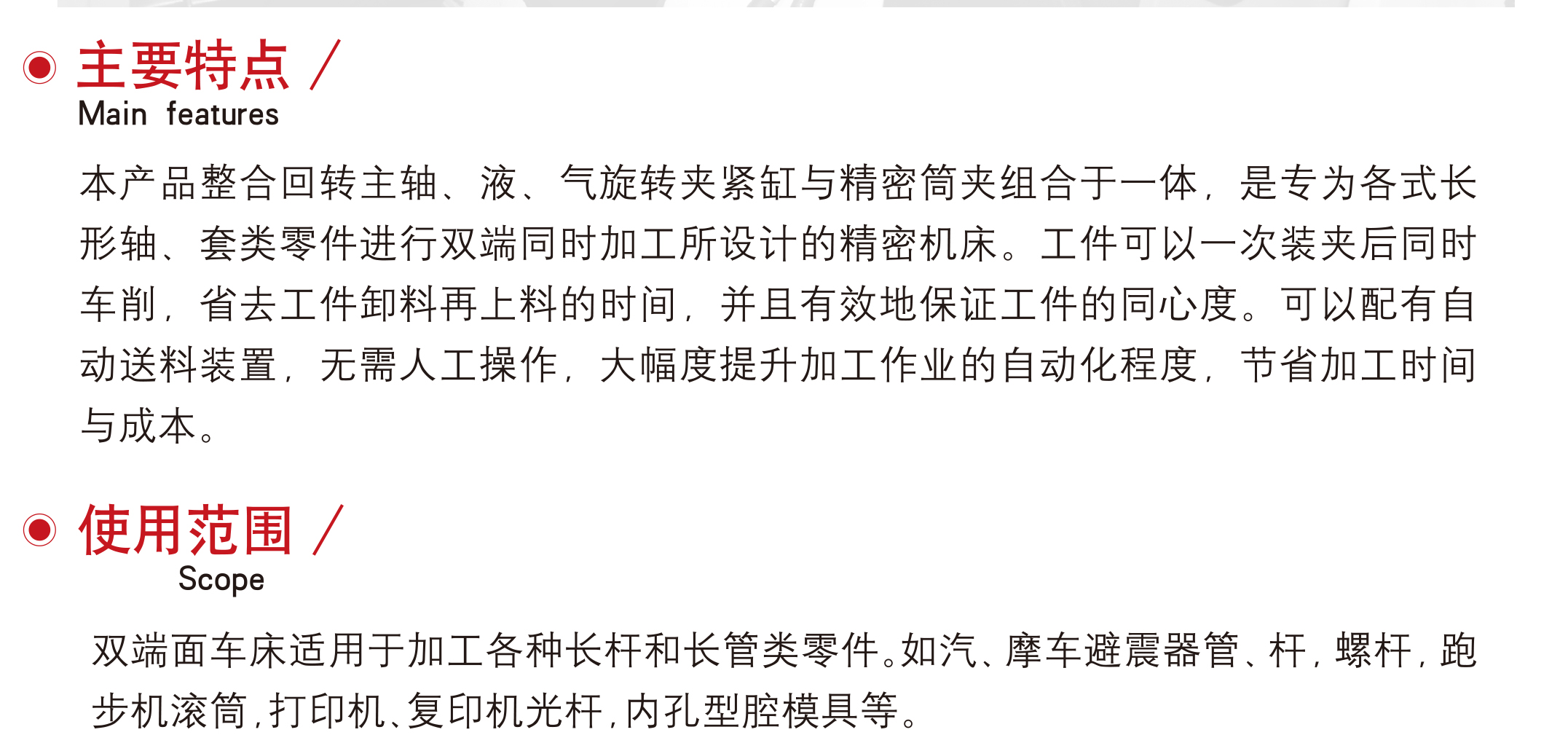 簡要描(miao)述: 本産(chan)品整合(he)回轉主(zhu)軸、液、氣(qi)旋轉夾(jia)緊缸與(yu)精密筒(tong)夾組合(he)于一體(ti),是專爲(wei)各式長(zhang)形軸、套(tao)類零件(jiàn)進行雙(shuang)端同時(shí)加工所(suǒ)設計的(de)精密機(ji)床。工件(jiàn)可以一(yi)次裝夾(jia)後同時(shi)車⁉️削,省(shěng)去工件(jiàn)卸 料再(zài)上料的(de)時間,并(bìng)且有效(xiào)地保證(zhèng)工件的(de)同心度(dù)。