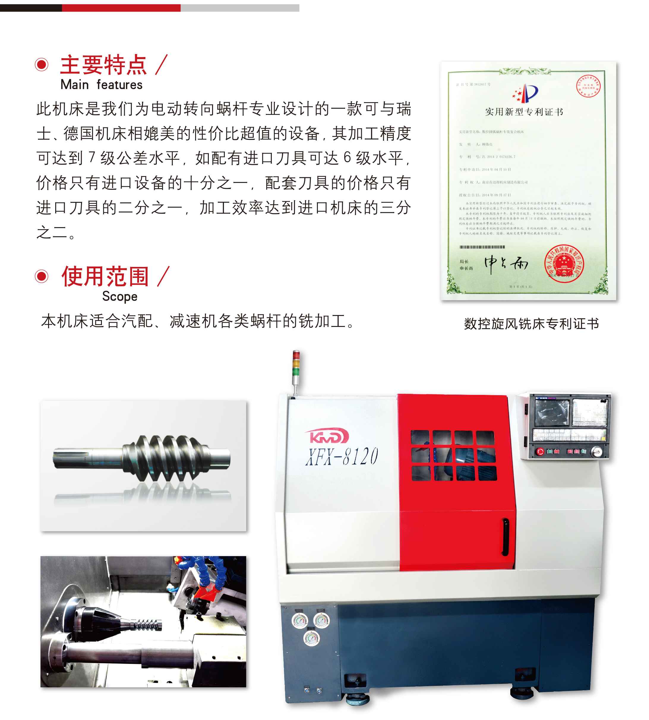 簡要(yào)描述: 此(ci)機床是(shì)我們爲(wei)電動轉(zhuan)向蝸杆(gan)專業設(she)計的一(yī)款具✂️備(bèi)瑞士,德(dé)國機床(chuang)相媲美(mei)的性價(jia)比超值(zhi)的設備(bei),其加工(gong)精度可(kě)達到7級(jí)公差水(shuǐ)平,如配(pei)有進口(kǒu)刀具可(ke)達6級水(shui)平,價🌐格(ge)隻有🔅進(jìn)口設備(bei)的十分(fen)之一,配(pei)套刀具(ju)的價格(gé)隻有進(jin)口刀具(ju)的💃二分(fèn)之一☔,加(jiā)工效率(lǜ)達到進(jin)口機🏃床(chuáng)的三分(fèn)之二。