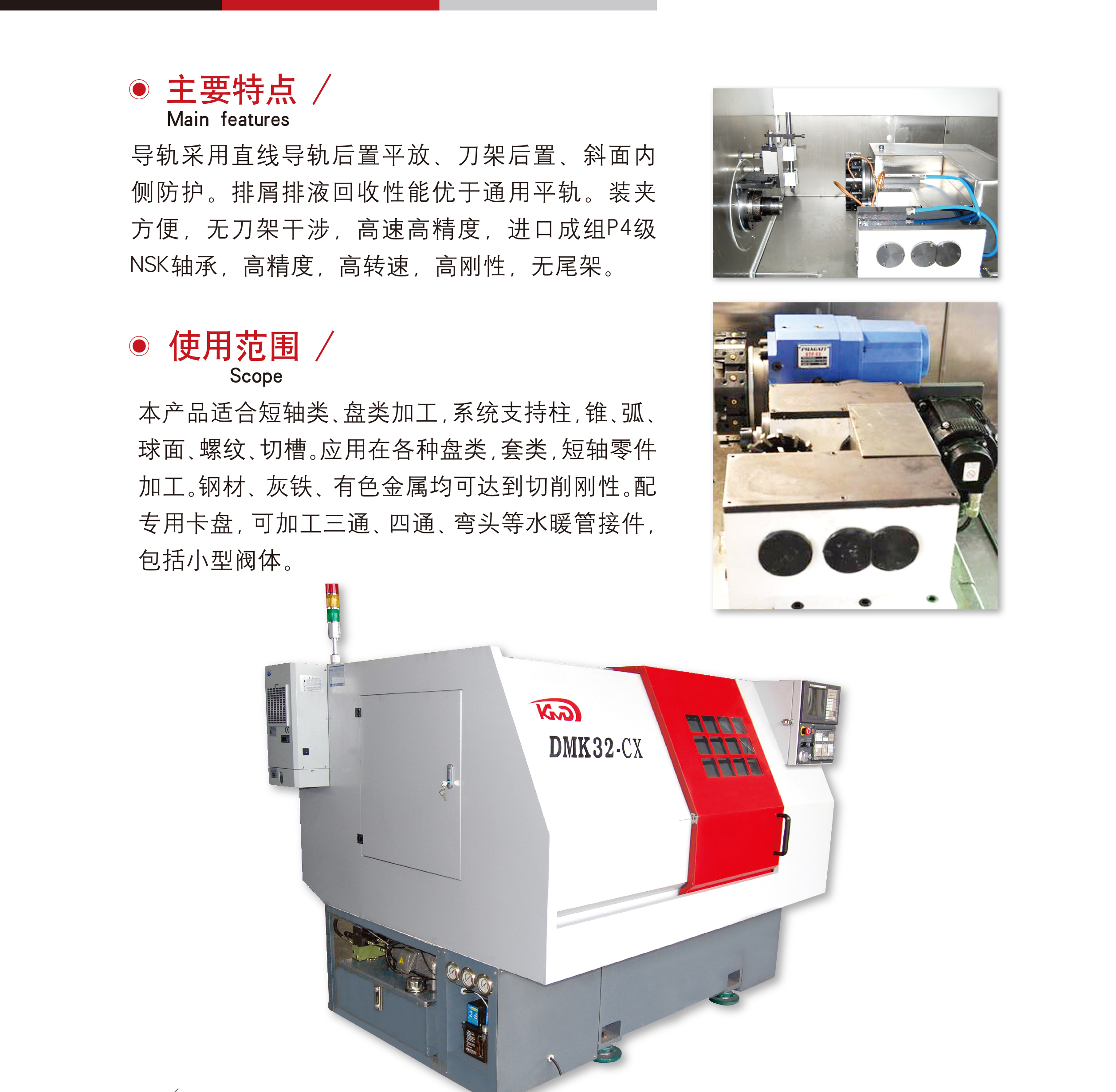 簡要(yao)描述: 導(dao)軌采用(yòng)直線導(dao)軌後置(zhì)平放、刀(dāo)架後置(zhì)、斜面内(nei)側防護(hu)⛱️。排屑排(pái)液回收(shou)性能優(yōu)于通用(yòng)平軌。裝(zhuang)夾方便(bian),無刀架(jia)幹涉,高(gao)速高精(jīng)度,進口(kǒu)成組P4級(jí)NSK軸承,高(gāo)精度,高(gāo)轉速,高(gāo)剛性,無(wu)尾架。